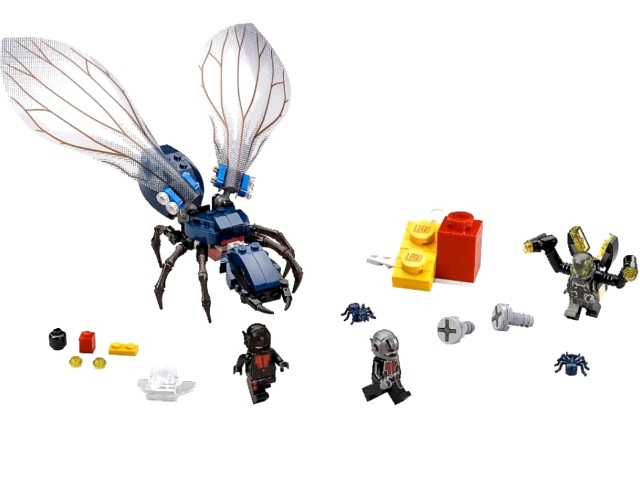 Также в набор входят детали для создания масштабной Лего-катапульты, стреляющая шурупами, 2 фигурки муравьёв и 3 минифигурки с аксессуарами: Человек-муравей, Хэнк Пим и Жёлтый Жакет.