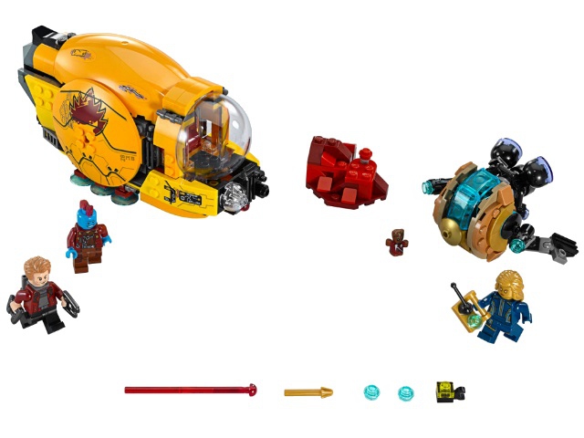 - 3 минифигурки с оружием и аксессуарами: Звёздный Лорд, Йонду и Аиша