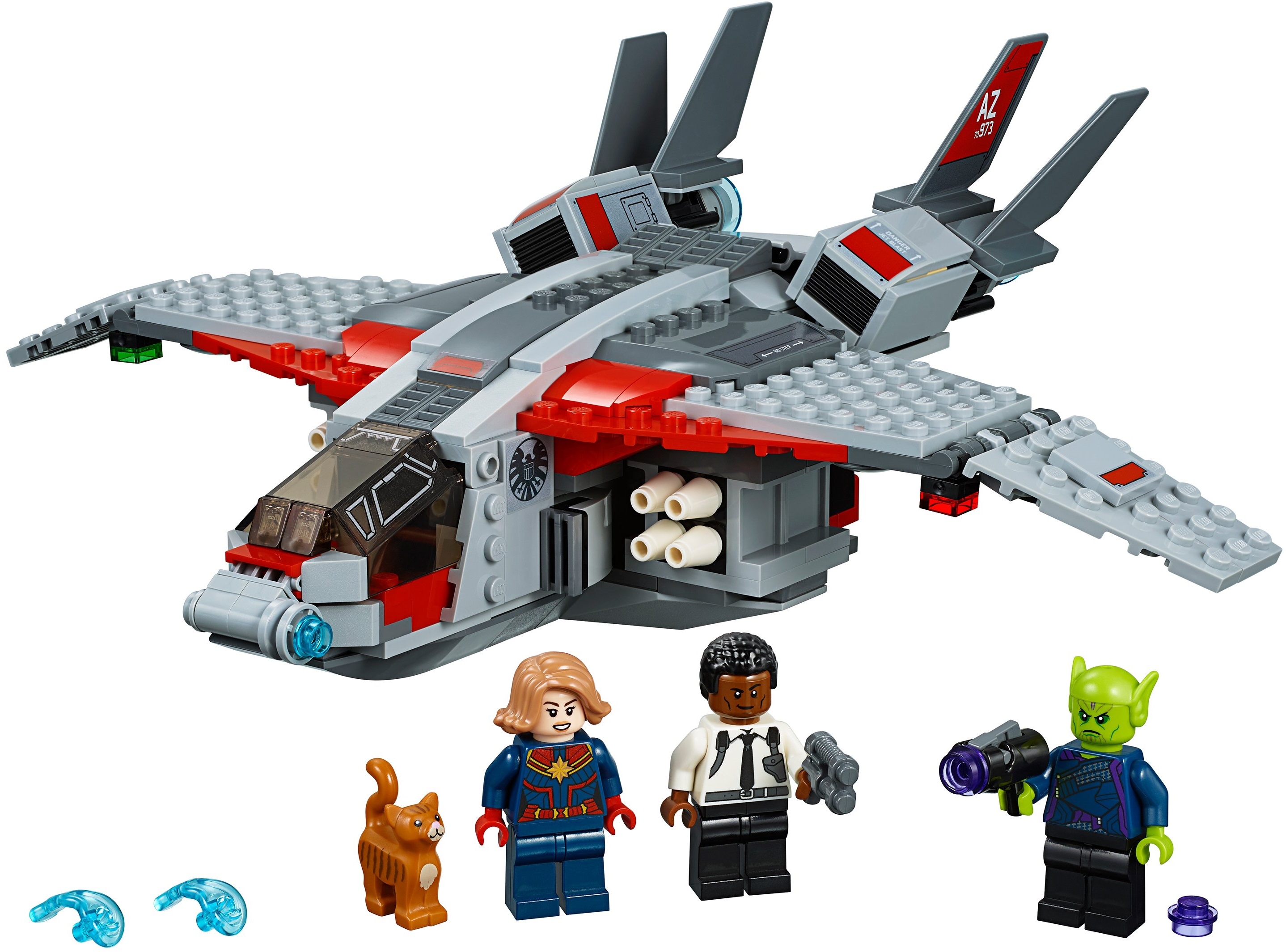 В конструктор lego Super Heroes 76127 вошли 3 минифигурки: Капитан Марвел, Ник Фьюри и скрулл Талос; а также фигурка кота-флеркина Гуси.