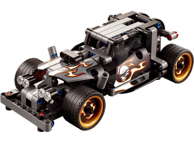 Автомобиль для побега из набора Лего 42046 представляет собой абсолютно новую дизайнерскую модель транспортного средства. Его корпус выполнен из деталей серо-чёрного цвета с добавлением контрастных наклеек, напоминающих языки пламени. Спереди виден массивный капот, оборудованный воздухозаборником, двумя парами фар и усиленным бампером, созданным для защиты автомобиля при столкновениях.