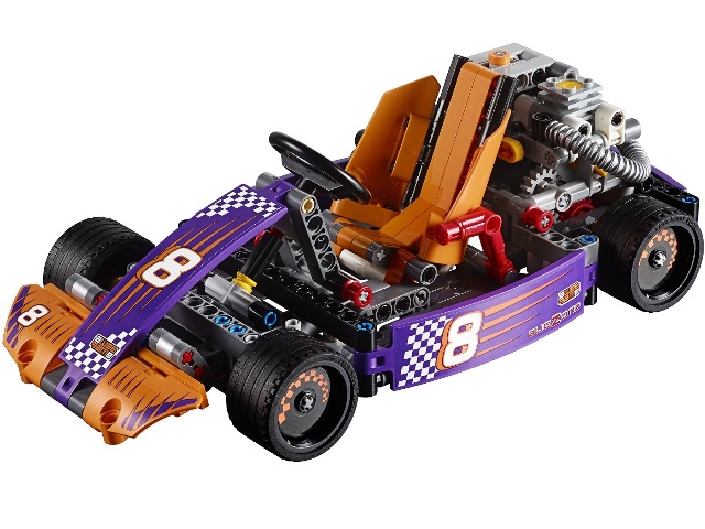 Гоночный карт из набора Лего 42048 представляет собой транспортное средство, созданное специально для скоростных заездов и соревнований. Его корпус выполнен из серо-чёрных деталей с добавлением контрастных оранжевых и фиолетовых элементов, украшенных наклейками. Спереди закреплён массивный спойлер, защищающий машину при столкновении. За ним видна просторная кабина, окружённая дугообразными бамперами.