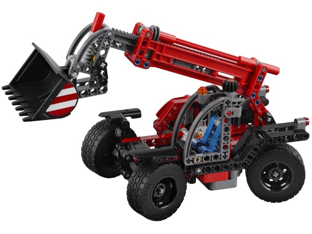 Для работы на строительной площадке или в песчаном карьере Вам обязательно пригодится телескопический погрузчик из набора Лего 42061. Его прочный корпус выполнен из контрастных красно-серых деталей. Центральное место в конструкции отведено вместительной кабине, оборудованной удобным водительским креслом, рулём, защитными боковыми рейками и сигнальными огнями. Перед кабиной виден массивный капот. Он снабжён противоударным бампером и прозрачными круглыми фарами, позволяющими выполнять множество работ даже в тёмное время суток.