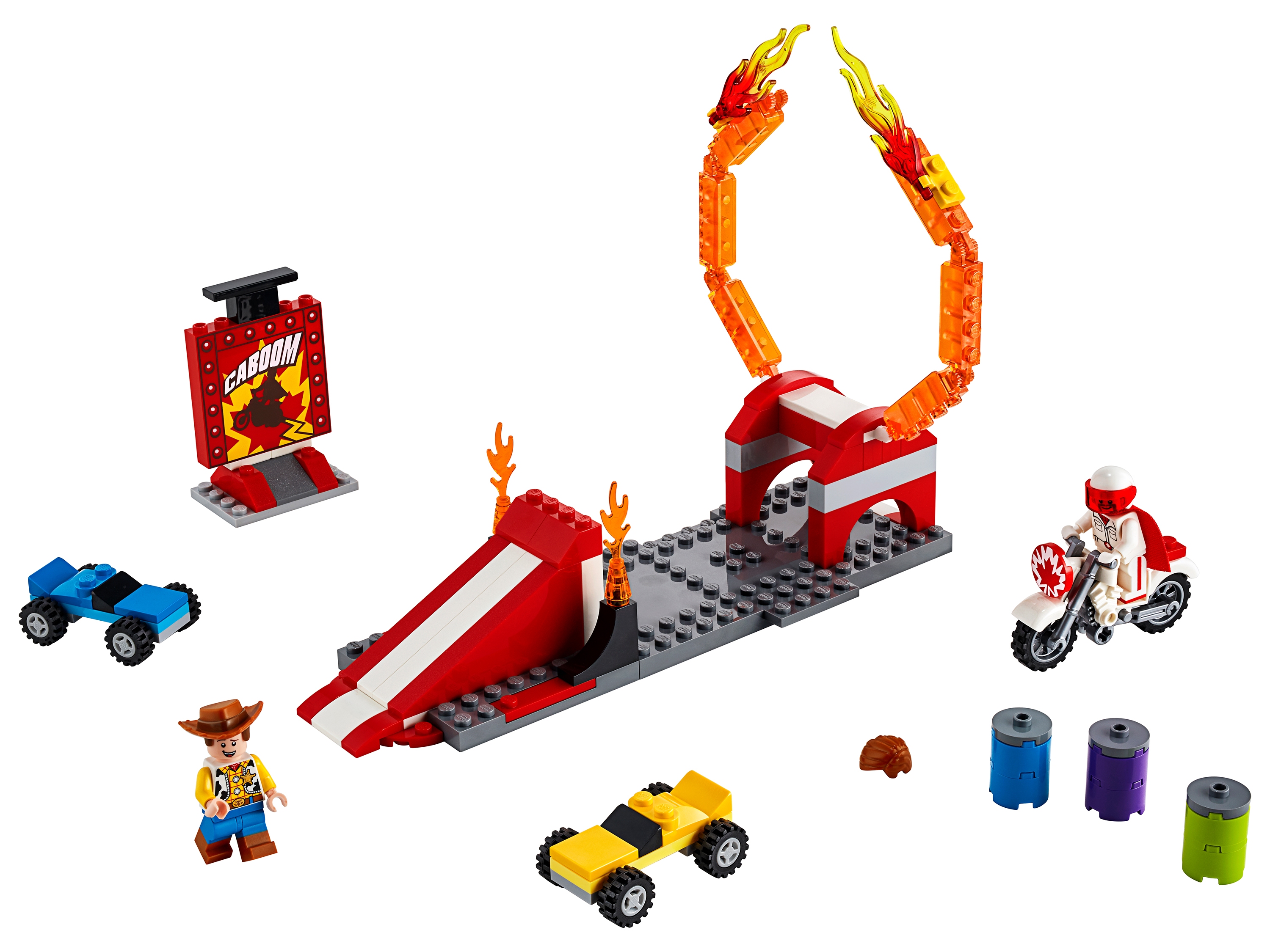 Персонажи любимого мультфильма «История игрушек 4» уже готовы проделать головокружительные трюки! Из деталей конструктора Лего 10767 собери рампу для прыжков и Огненное кольцо, одень защитный шлем на голову каскадера и вперед, удивлять зрителей!