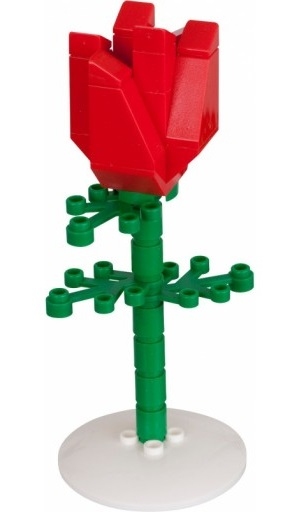 Внутри него на специальной круглой подставке закреплён нежный цветок. Его лепестки выполнены из деталей классического красного цвета, а на тонком зелёном стебельке видны три ажурных листика.