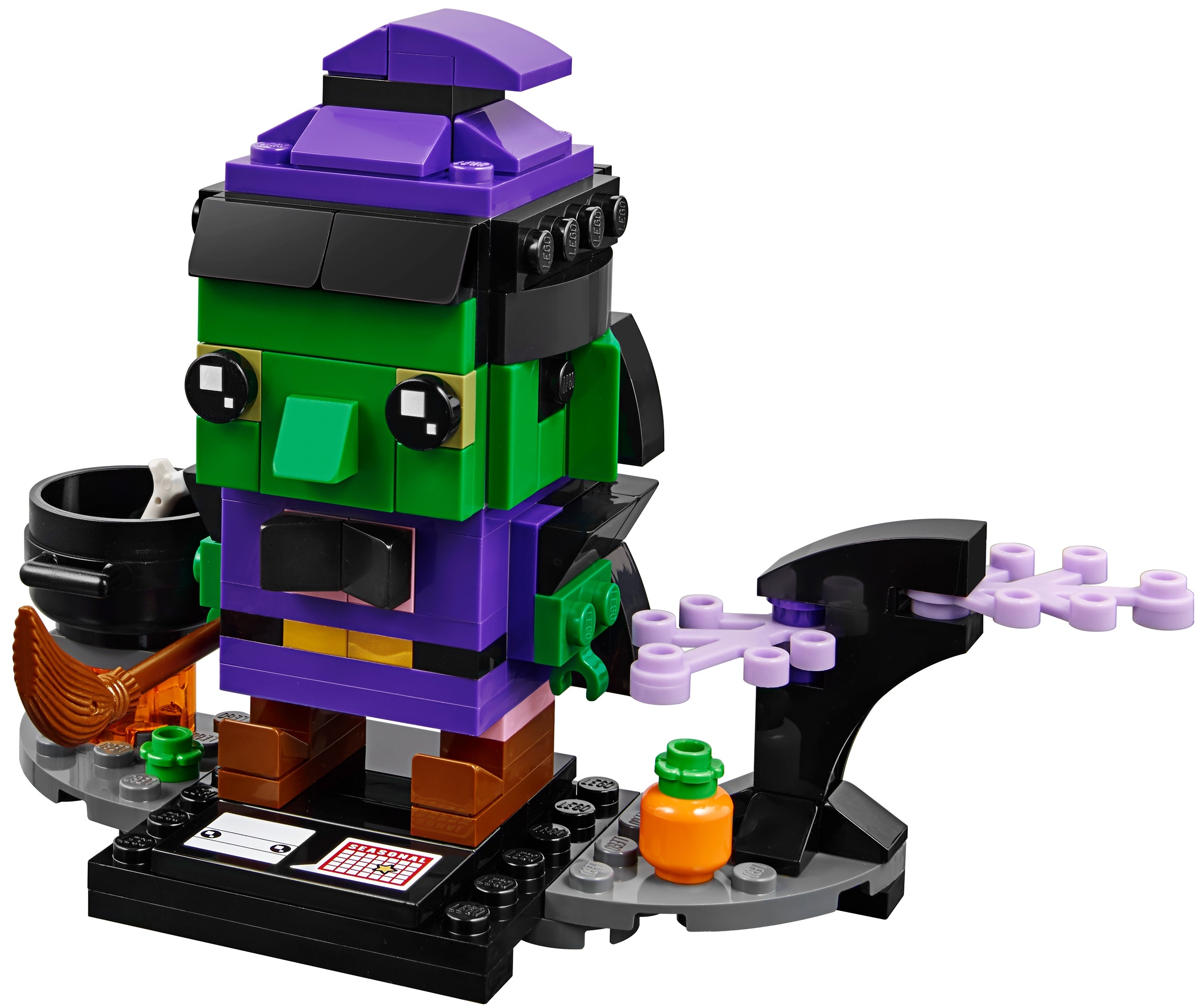 Как и все конструкторы серии BrickHeadz, набор 40272 укомплектован демонстрационной панелью. Установите на нее фигурку ведьмы, присоедините с одной стороны подиум с котлом на огне, а с другой – с растущим деревом. В таком виде конструктор можно хранить на полке в перерывах между играми. Интересная композиция прекрасно дополнит вашу коллекцию фигурок Лего.