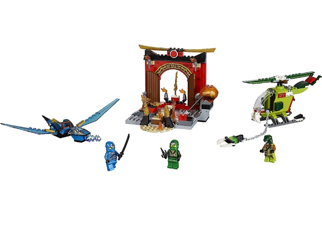 В затерянном храме ниндзя хранится могущественное оружие – золотой меч стихии Огня. Стать его обладателям мечтают многие герои, но добраться до храма и преодолеть все препятствия под силу далеко не каждому. Для этой сложной миссии клан змей построил боевой вертолёт с множеством активных функций. Его корпус выполнен из ярко-зелёных деталей с добавлением контрастных красных элементов.