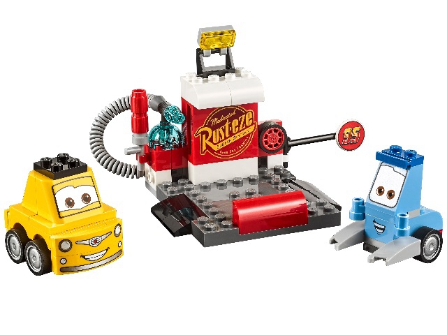 Из деталей набора Лего 10732 Вы сможете собрать настоящую установку для пит-стопа. Она базируется на прочной серой плите, по бокам от которой устроены удобные пандусы для заезда. Спереди виден защитный отбойник, а напротив – стойка с мощным прожектором и рабочим оборудованием. Слева поставлена канистра с топливом и гибкий шланг для подачи воздуха. Справа зафиксировано запасное колесо, которое может понадобиться Молнии МакКуину во время гонки. Для соблюдения все правил пит-стопа стойка оборудована подвижным сигнальным знаком с указанием номера гонщика.