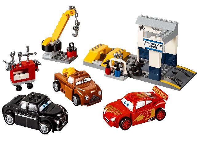 Из деталей набора Лего 10743 Вы сможете построить модель гаража Смоуки. Его фасад выполнен в бело-синем цвете. Сверху видна серебристая крыша, украшенная вывеской. Под ней скрывается П-образный проезд, ведущий в ремонтный отсек. Рядом с открывающимся прозрачным окном закреплены выключатели и трубы. Напротив них расположена стойка для рабочих инструментов и держатель для новых шин.