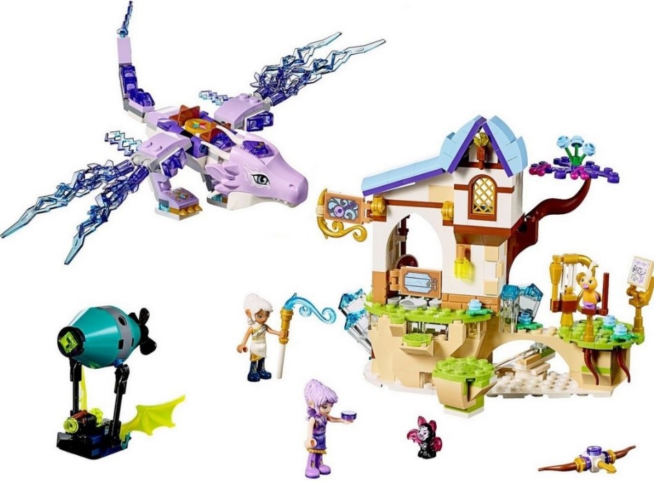 Из деталей набора Лего 41193 Вы сможете построить модель музыкальной школы. Условно её конструкцию можно разделить на две части. Слева располагается двухэтажный домик с белоснежными стенами и бревенчатыми перекрытиями. Наверху видна двускатная голубая крыша, украшенная вывеской и драгоценным камнем-фонарём. С противоположной стороны растёт изогнутая ветка дерева с раскидистой кроной, цветами и плодами.