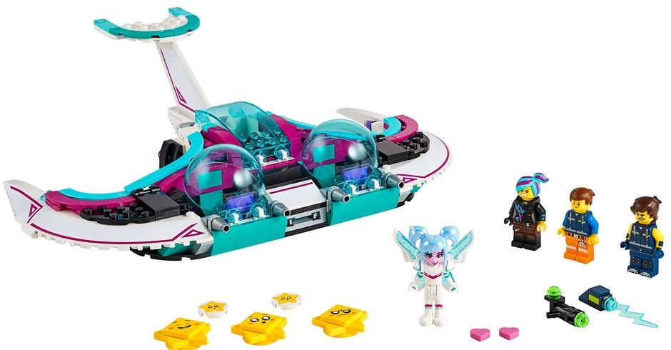Звездолёт из Лего фильма 2 70849 рассчитан на двух пилотов. Посади в кабины Мими Катавасию и Дикарку — и отправляйся в полет. Дикарка Люси всегда мечтала о новых приключениях и открытиях, так что она не откажется пуститься в дальний полет вместе с Мими. А вместе они — сила! Ведь одна будет вести космический корабль, корректировать маршрут или прокладывать новый, а вторая — прицельно отстреливаться из шутера от преследующих их врагов! Она может стрелять из дискомёта или сбрасывать вниз бомбы в виде звёздочек.