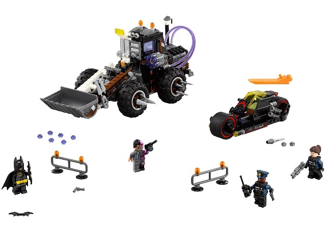Из деталей набора Лего 70915 Вы сможете собрать модель экскаватора Двуликого. Как и его хозяин, экскаватор имеет две стороны. Первая «хорошая» напоминает обычную грузовую технику, выполненную в бело-оранжевом цвете. Центральное место в конструкции отведено кабине водителя с прозрачным стеклом и рулевым управлением. Над кабиной виден противотуманный прожектор и сигнальные огни, а позади неё – длинная выхлопная труба и небольшой открывающийся ящик для рабочих инструментов.