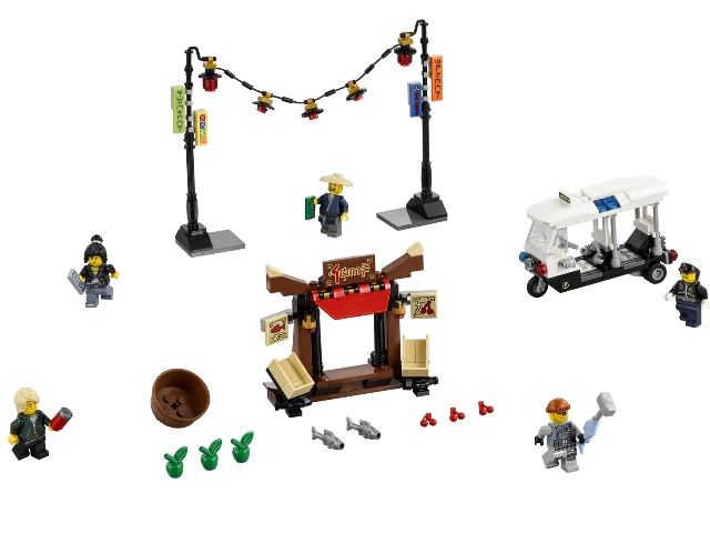 Из деталей набора Лего 70607 Вы сможете построить продуктовый киоск. Его фасад выполнен в коричневом цвете. Центральное место в конструкции занимает открытое окно, оборудованное прилавком. Под угловатой крышей видна прямоугольная вывеска (перевод иероглифов «Магазин») и козырёк, способный менять своё положение. По бокам сделаны крепления для двух красных фонариков, подсвечивающих таблички с ассортиментом киоска. Внизу предусмотрены подставки для ящиков. В одном разложена свежая рыба, а во втором - вишенки. Яблоки хранятся в деревянной кадушке, поставленной рядом с киоском.