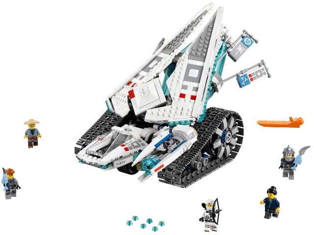 Из деталей набора Лего 70616 Вы сможете построить ледяной танк. Его корпус выполнен в бело-сером цвете с добавлением красных и синих акцентов. Спереди располагается вытянутая кабина, прикрытая прозрачным лобовым стеклом. Подняв его, можно рассмотреть место водителя, приборную панель и рычаги управления. Под кабиной видны фары и сигнальные огни, а позади неё – длинные выхлопные трубы.