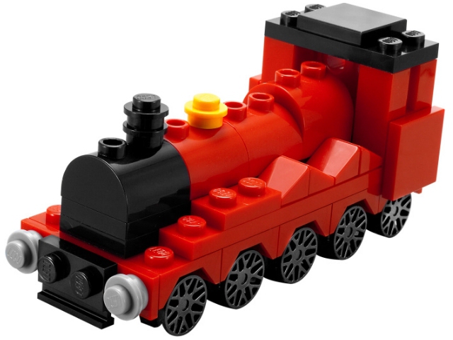 В наборе Лего 40028 вы найдёте уменьшенную копию локомотива ярко-красного цвета. Он оснащён пятью парами колёс, фарами и трубой.