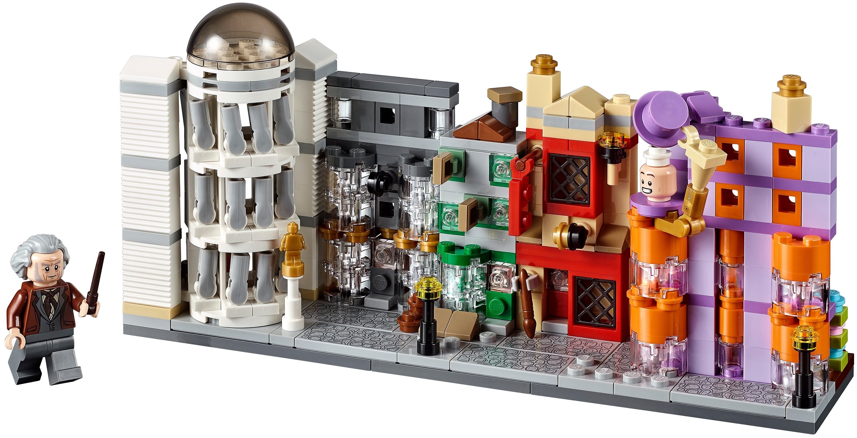 Освещают Косой переулок фонари, стоящие вдоль вымощенного булыжником тротуара. Чтобы воссоздать мощеную улицу, используются 6 деталей размером 2х4 с необычным и редким принтом.