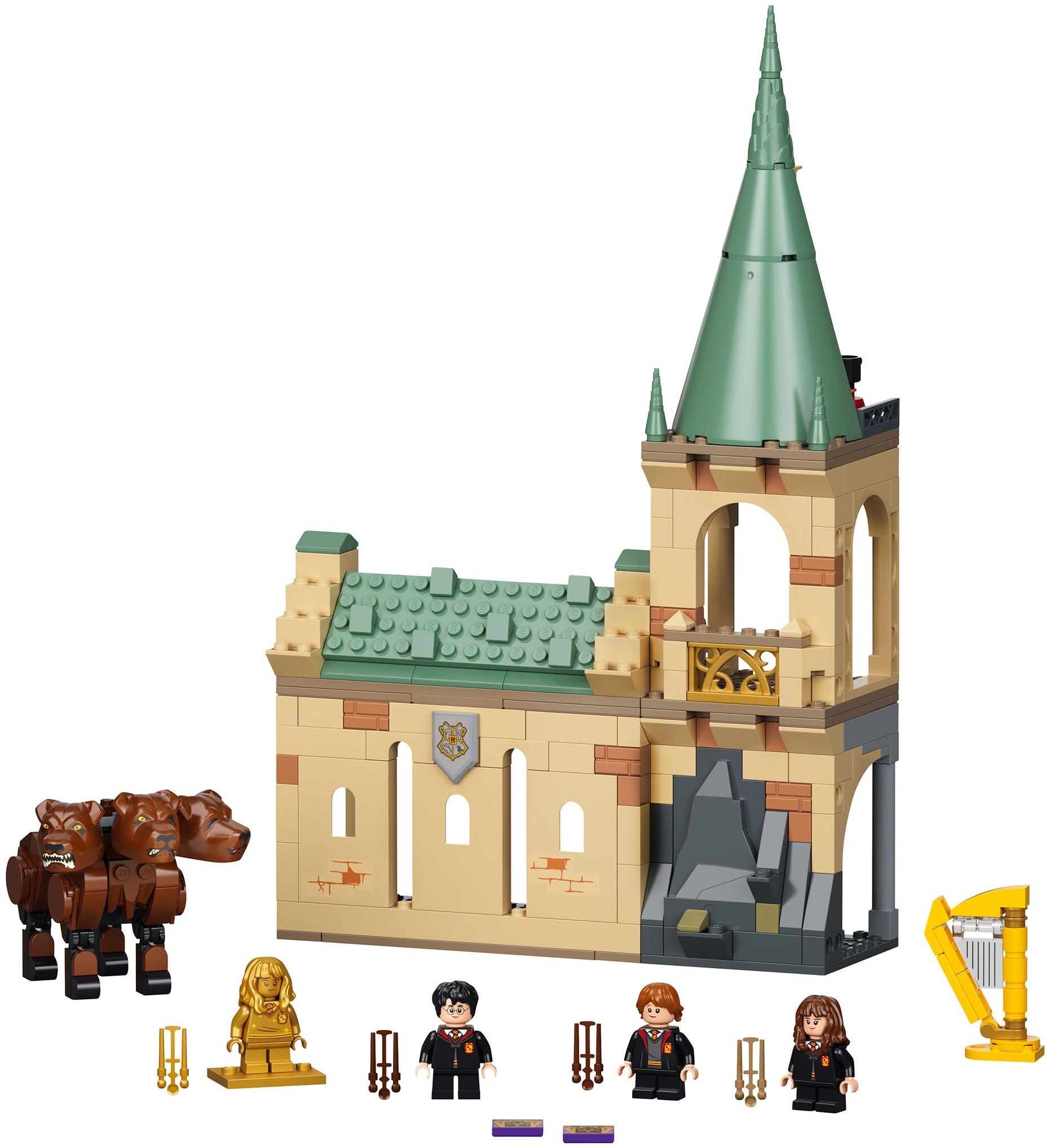 В конструкторе есть минифигурки Гарри Поттера, Гермионы Грейнджер и Рона Уизли. Кроме того, приятным сюрпризом станет золотая юбилейная фигурка Гермионы. Здесь вы найдете множество уникальных аксессуаров. Это факелы для освещения темных закоулков, приманка для собаки и волшебная арфа, а также волшебные палочки для каждого героя.