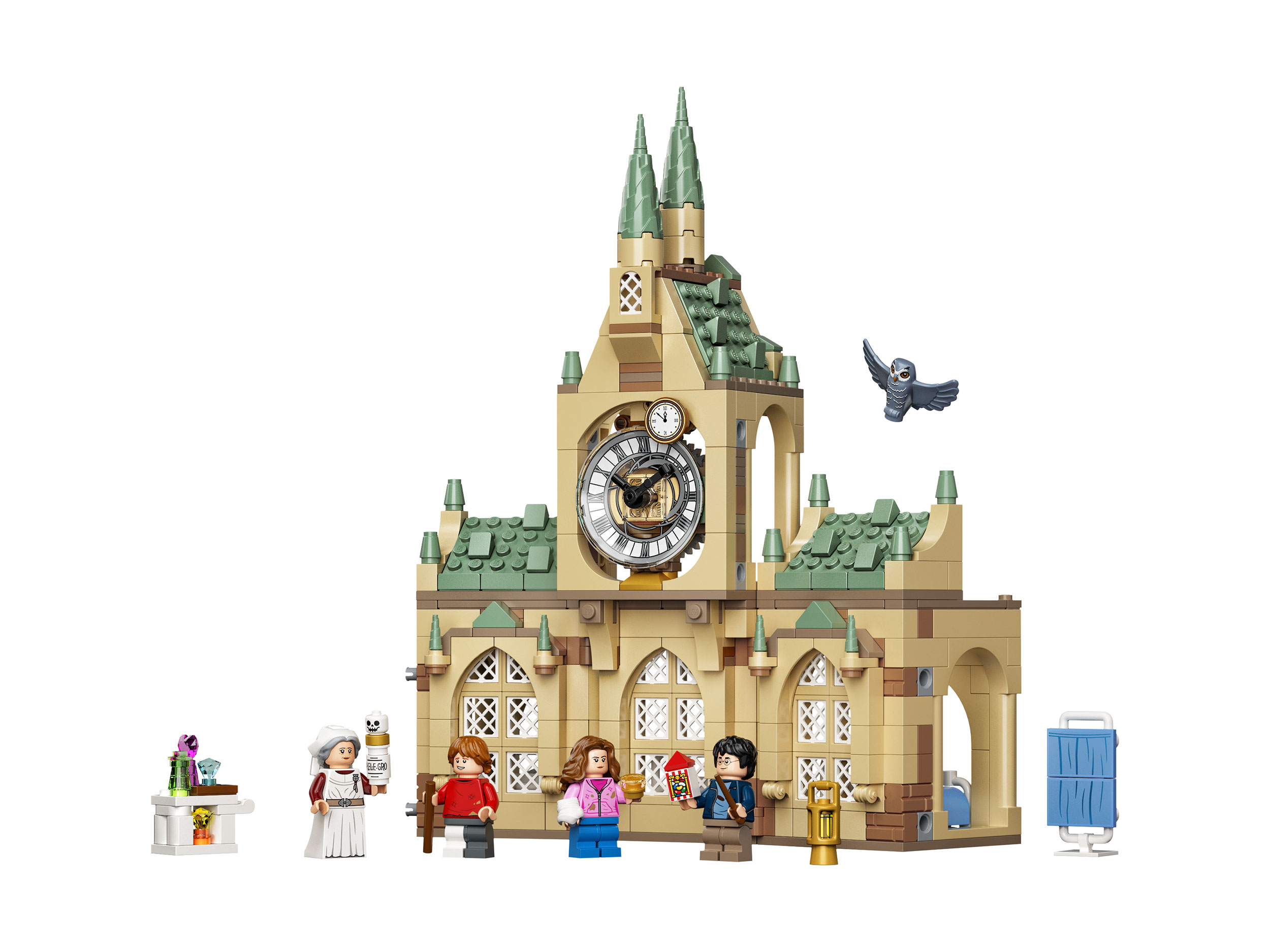 Двухуровневое больничное крыло замка бежевого цвета вмещает несколько изолированных мест для стационарного лечения. Каждое из них оборудовано удобной кроватью с голубым бельем, тумбочкой с личными вещами и большим стрельчатым окном. За здоровьем пациентов следит добрая мадам Помфри, одетая в форму сестры милосердия. Она следит за порядком и дает магическое лекарство юным волшебникам.