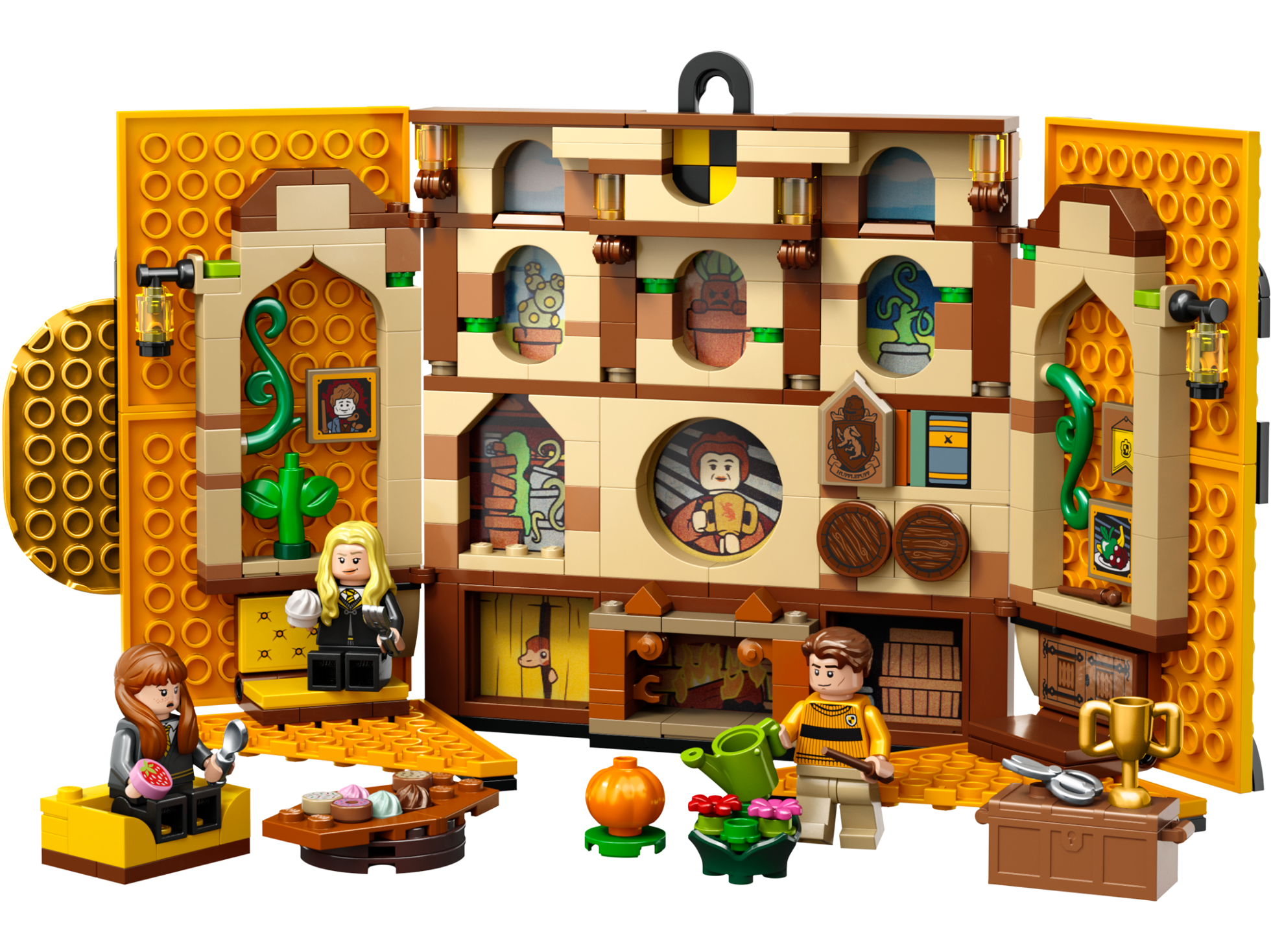 Вымпел факультета Пуффендуй из Lego 76412 не только украсит вашу комнату, но и позволит насладиться игрой с любимыми персонажами. Раскрыв створки знамени, вы окажетесь в уютной гостиной, где стоят два кресла, столик с угощениями, сундук с артефактами, камин и множество растений.