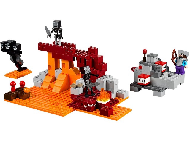 Из деталей набора Лего 21126 Вы сможете построить подробную модель крепости Нижнего мира. В основе конструкции лежат несколько оранжевых плит, напоминающих лавовое озеро, соединённое с водопадом. Поверх лавы устроены острова, состоящие из разных блоков. Слева виден небольшой холмик, на котором растут Адские наросты. Во время созревания они проходят четыре стадии роста, по окончании которых наросты можно собирать и использовать для приготовления зелья.