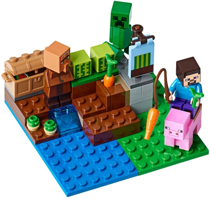 Из деталей набора Лего 21138 Вы сможете собрать модель арбузной фермы. Её основанием служат две прямоугольные пластины. Одна напоминает голубые воды источника, а другая – ровный зелёный газон. В тыльной части фермы располагаются многоуровневые грядки. На них можно выращивать арбузы, картофель и морковь. Созревшие плоды следует хранить в массивном сундуке, поставленном у ручья. Под арбузной грядкой спрятан потайной механизм. Нажав на него, можно разрушить часть огорода, имитируя взрыв подкравшегося Крипера.