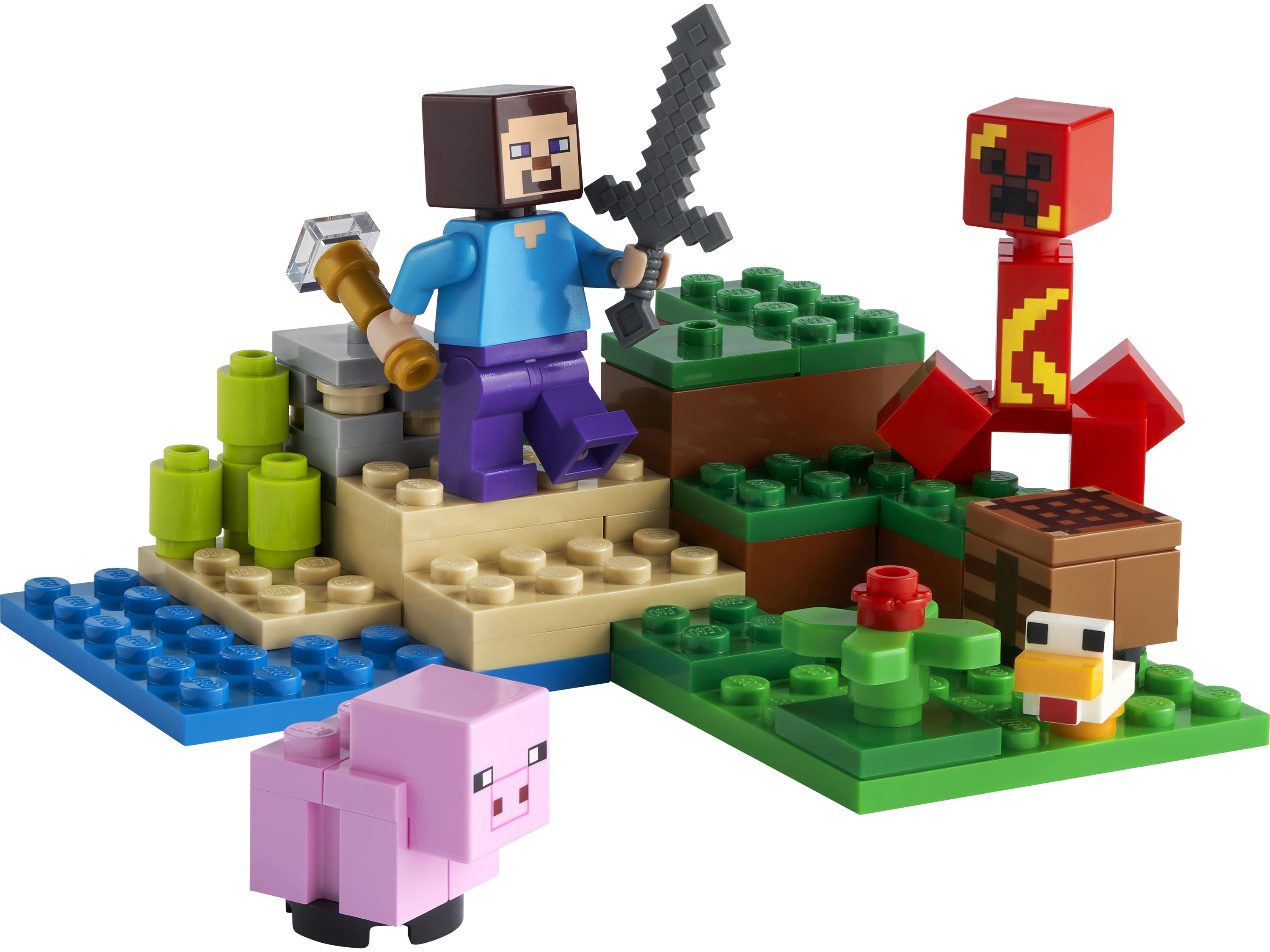 Соберите увлекательный комплект с помощью бумажной инструкции или специального электронного приложения и начните свои приключения в мире Майнкрафт. Главный герой Стив решил обустроиться на небольшом участке земли, где растет сахарный тростник и есть залежи железной руды, он даже успел обзавестись домашним хозяйством в виде поросенка и утенка. Однако все старания главного героя могут быть быстро разрушены Взрывным Кипером. Воспользуйтесь мечем Стива и секторным механизмом, который сможет отбросить злобного Крипера далеко от вашего участка.