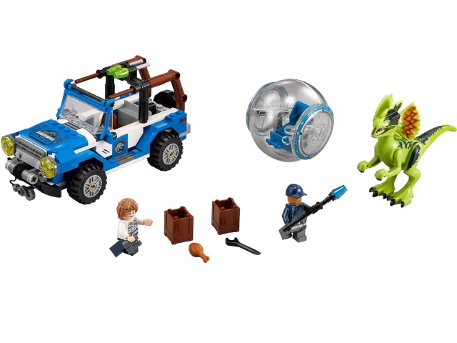 В наборе присутствует фигурка Дилофозавра с подвижными конечностями, хвостом, шеей и нижней челюстью, а также 2 минифигурки с аксессуарами: Грей и сотрудник службы безопасности парка.