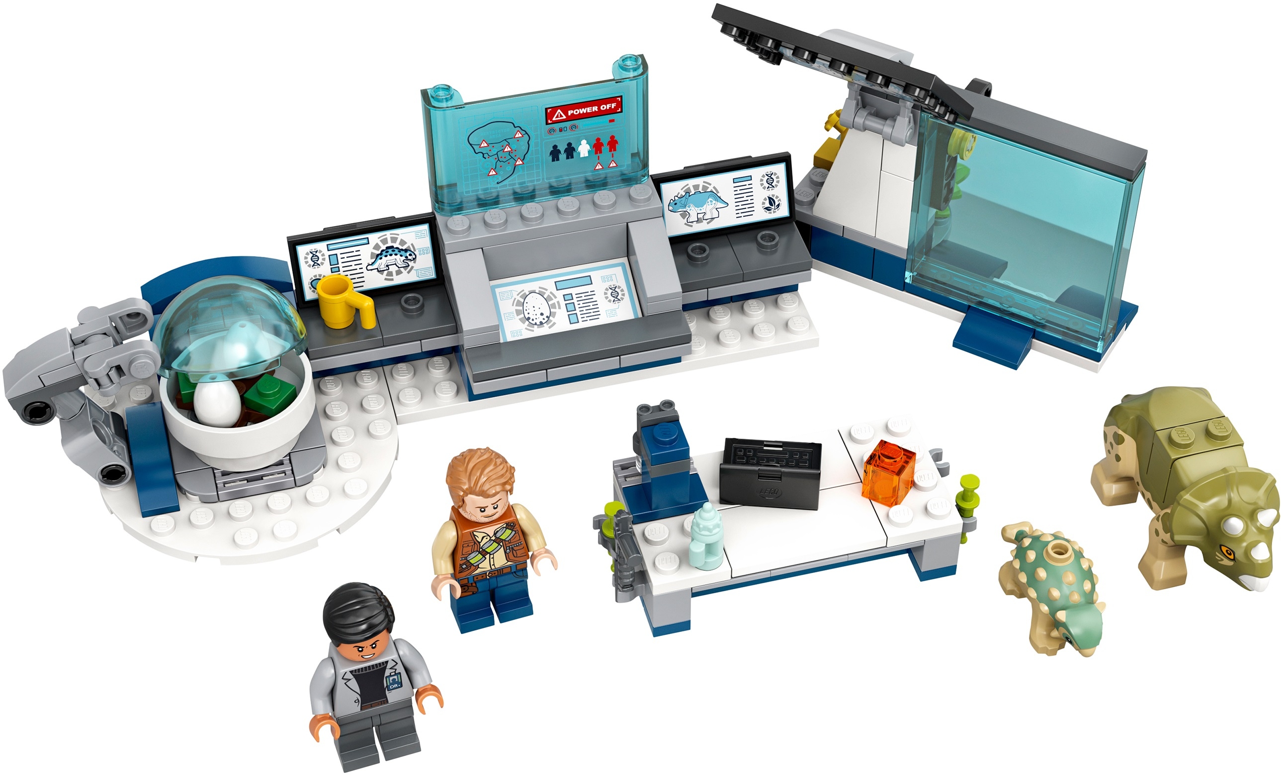 Из всех элементов конструктора Лего Мир Юрского периода 75939 собирается небольшая лаборатория и стол, на котором располагается ноутбук, микроскоп, шприцы, окаменелый комар с ДНК динозавров и другие аксессуары. В левой части лаборатории установлен инкубатор с яйцами и механизированная клешня для их переноса. В центральной части располагается главный компьютер с монитором, где высвечивается вся важная информация, касаемая парка. Правая часть лаборатории служит специальной клеткой для трицератопса, где есть трава и краник с водой. А с помощью специального рычага, при легком его нажатии, часть стеклянной стены выбрасывается в сторону, что позволяет выбраться динозавру на волю. С обратной стороны лаборатории вмонтирован щиток с экстренными рычагами управления и сигнальными маячками. В собранном виде высота набора составляет около 10 см, в длину 22 см и в ширину 8 см.