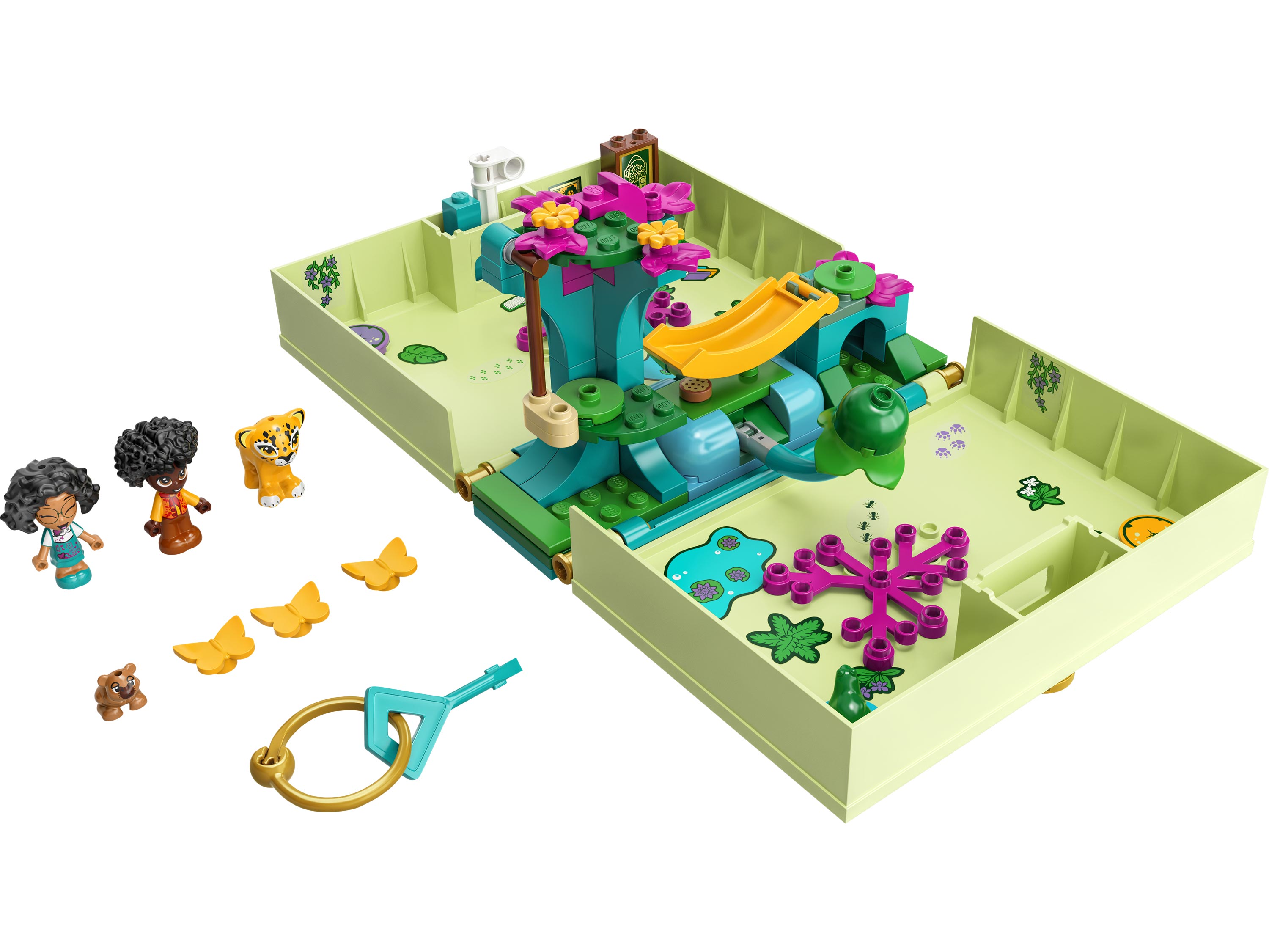 В комплект входит 2 минифигурки: Антонио и Мирабель; а также фигурки животных: ягуар, капибара и лягушонок.