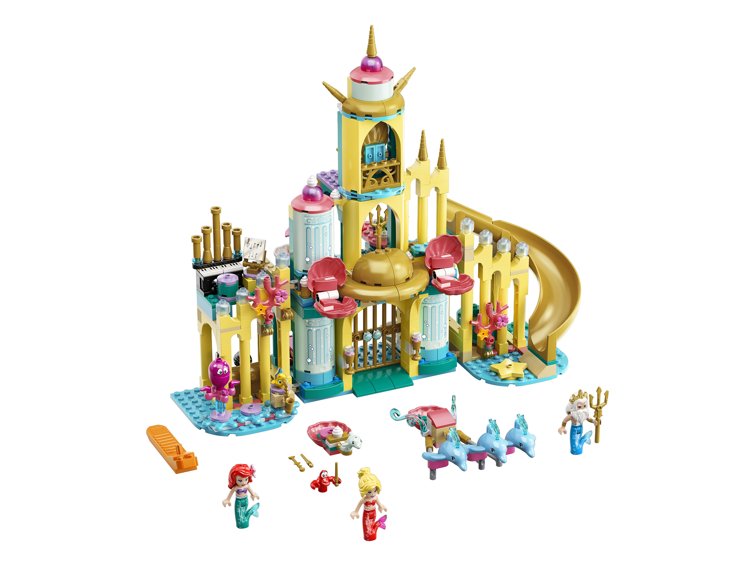 Также в конструкторе Lego Disney Princess 43207, который можно купить у нас, есть фигурки морских обитателей: красный краб Себастьян, маленькая желтая рыбка Флаундер. Для колесницы Тритона предназначены три больших дельфина, а для колесницы Себастьяна — один маленький дельфин.