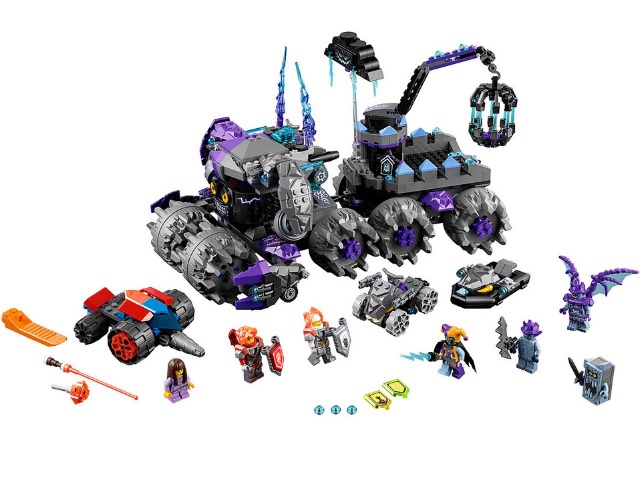 Из деталей набора Лего 70352 Вы сможете собрать подробную и многофункциональную модель передвижного разрушителя Джестро. Его массивный бронированный корпус выполнен в серо-фиолетовом цвете. Спереди располагается мощный тягач, напоминающий собой злобного шута с жёлтыми прищуренными глазами и кривой улыбкой. Базируется тягач на четырёх огромных колёсах, передняя пара которых превращена в каменный валик, способный катится по любой поверхности и преодолевать любые препятствия.