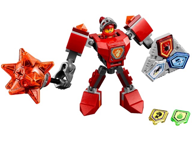 В наборе Лего 70363 Вы найдёте множество деталей для создания боевых доспехов Мэйси. Они выполнены в контрастном красно-сером цвете, заметном издалека. Сверху устроена небольшая ниша, предназначенная для минифигурки. Она прикрыта защитным нагрудником, украшенным отличительным знаком героини. По бокам от него видны шарнирные суставы, ведущие к рукам и ногам. Они очень подвижны, что позволяет принцессе принимать любые боевые стойки и не терять равновесие. В правой руке Мэйси сжимает увесистую булаву, а в левой – щит с тремя НЕКСО Силами.