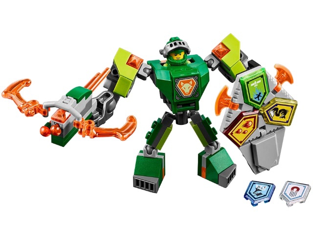 В наборе Лего 70364 Вы найдёте множество деталей для создания новых доспехов Аарона. Они выполнены в зелёно-сером цвете с добавлением салатовых и оранжевых элементов. Верхнюю часть занимает небольшая ниша, предназначенная для минифигурки. Снаружи она прикрыта прочной бронированной пластиной, защищающей рыцаря от вражеских ударов. По бокам от неё находятся шарнирные суставы. Они соединяют торс брони с руками и ногами, при этом помогают им реалистично двигаться. Во время боя Аарон может принимать боевые стойки, отражать атаки противников, стрелять из мощного арбалета и применять НЕКСО Силы, закреплённые на специальном щите.