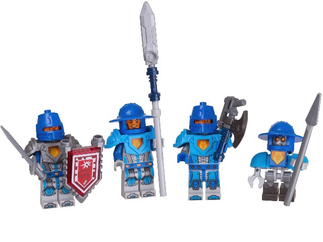В наборе Лего 853515 Вы найдёте фигурку бота-оруженосца и 3 минифигурки рыцарей, а также несколько видов оружия и брони: 4 защитных шлема (2 типа), 2 голубых брони, 1 серебристая броня, меч, штык, пика, секира и щит с НЕКСО Силой «Удар хлыстом».
