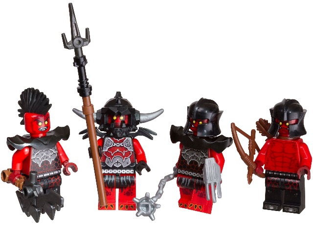 В наборе Лего 853516 Вы найдёте 4 минифигурки: Огнеметатель, Пепельный охотник и 2 Магмометателя, а также несколько видов оружия и брони: 3 защитных шлема (2 типа), 3 пары наплечников (2 типа), зазубренный меч, удлинённая пика, булава, лук и стрелы.