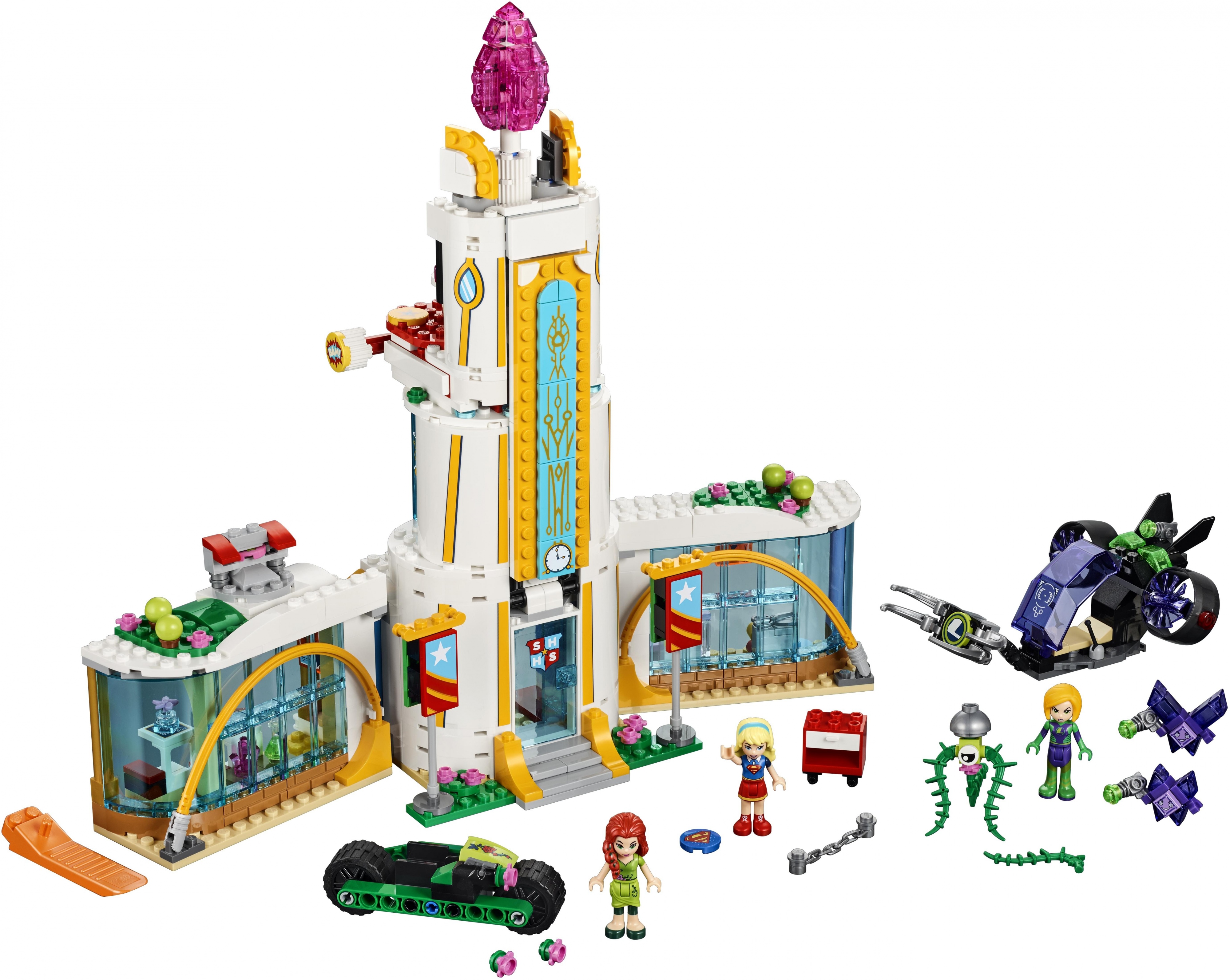 Из деталей набора Лего 41232 Вы сможете собрать подробную модель школы супергероев. Её фасад выполнен из бело-жёлтых элементов с добавлением изогнутых арок и орнаментов. Спереди располагается центральный вход, окружённый яркими флагами и цветочными клумбами. Поднявшись по ступеням и пройдя через прозрачную дверь с круглыми часами, можно очутиться внутри школы и рассмотреть её интерьер.