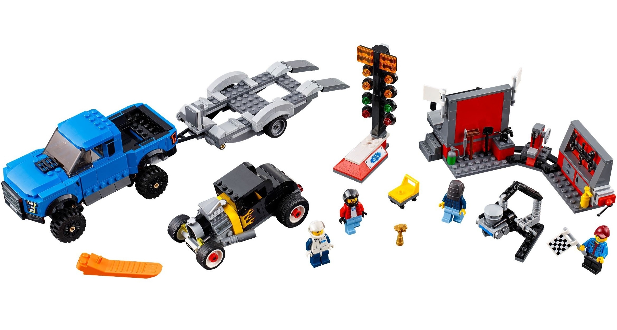 Также в наборе Вы найдёте 4 минифигурки с аксессуарами, подъёмник для тяжёлых грузов, башню со стартовыми огнями и гараж с рабочими инструментами, с обратной стороны которого устроен пьедестал почёта.