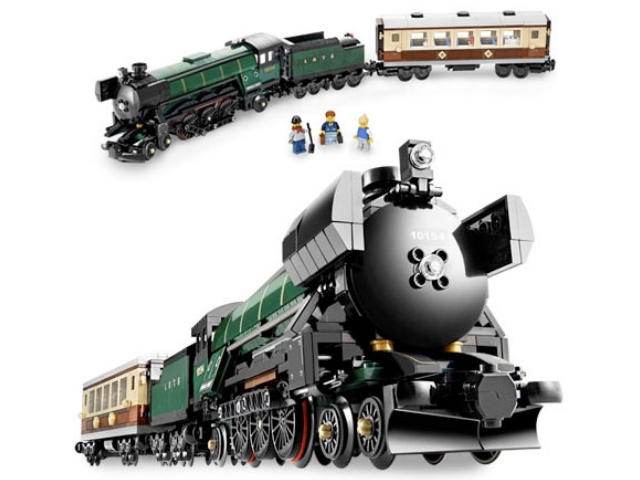 Модель ретро-поезда Изумрудная ночь из набора Лего 10194 состоит из локомотива, точно копирующего паровоз Скотсмен 20-х годов ХХ столетия и двух вагонов - пассажирского и товарного.